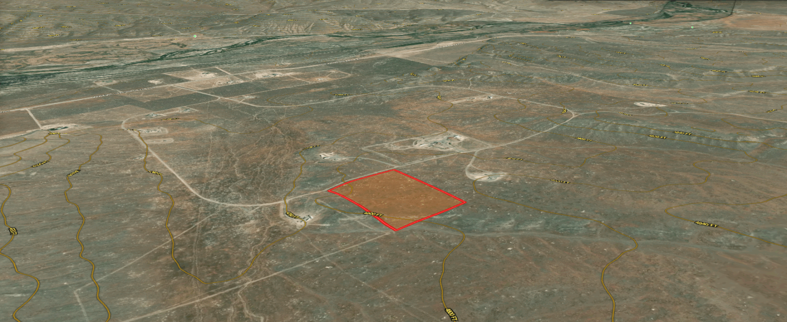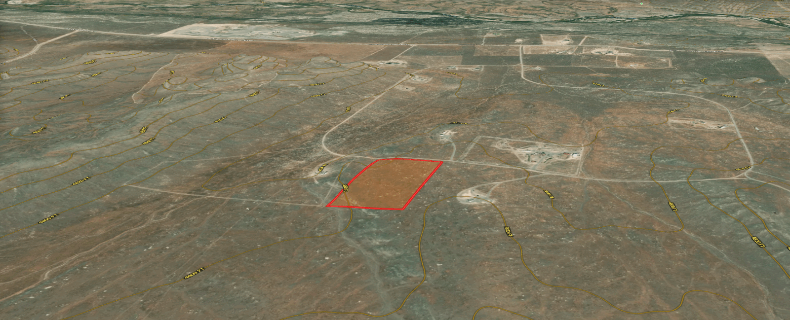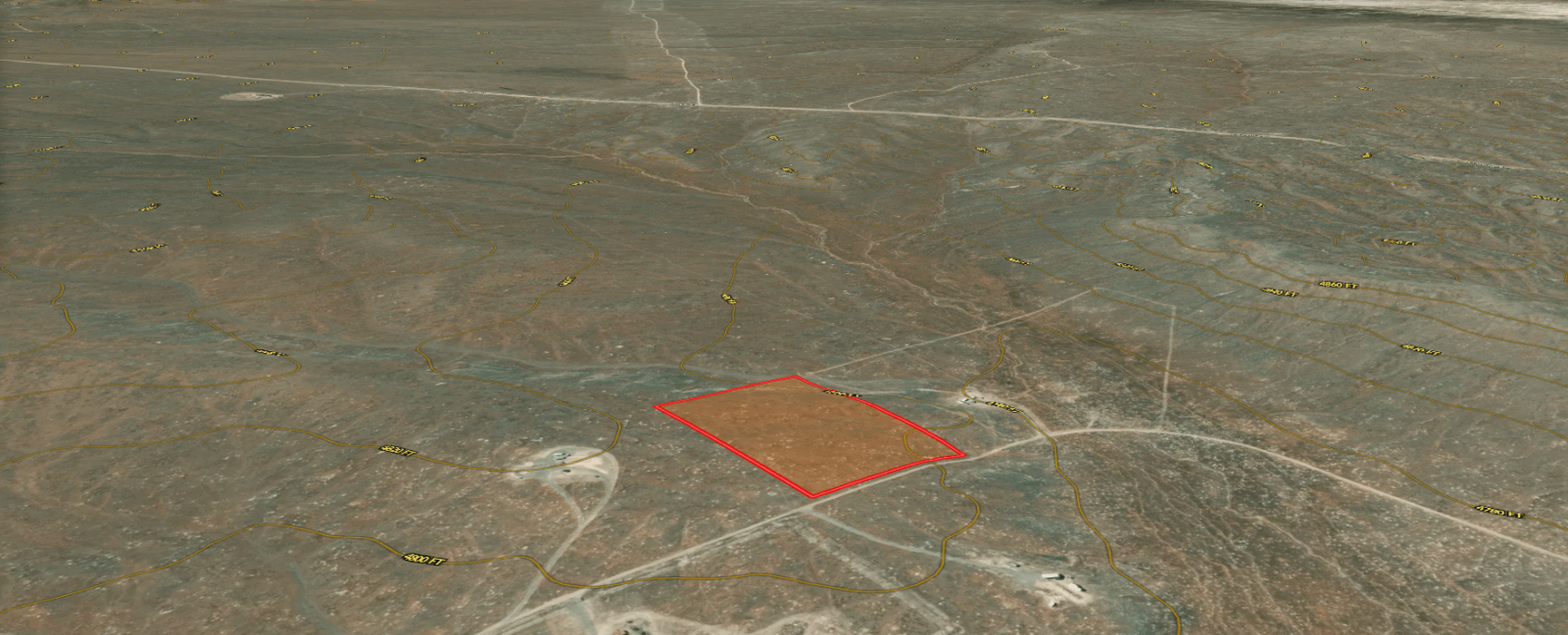 Access: No visible direct road County road access, possible access via unnamed dirt roads / trails.